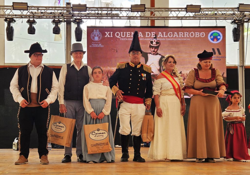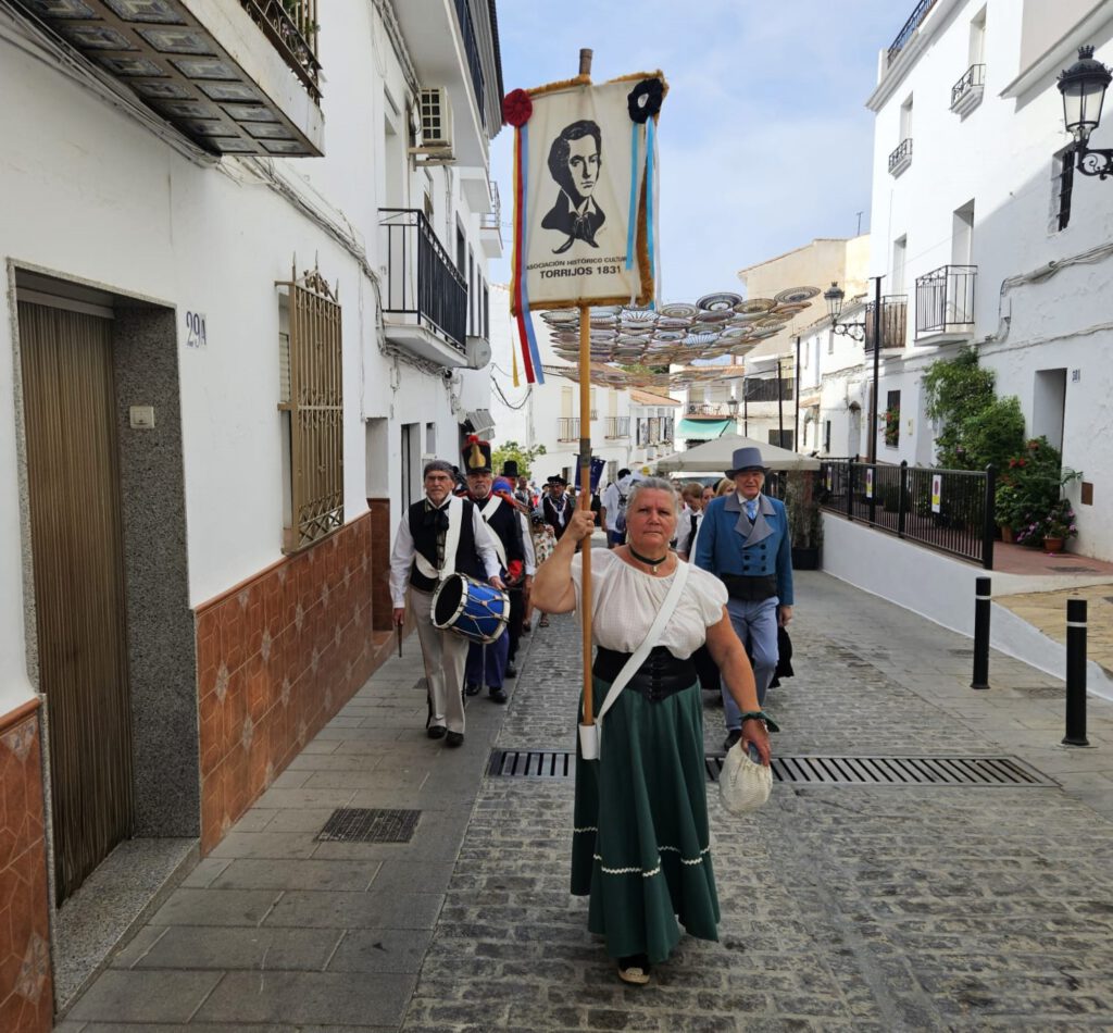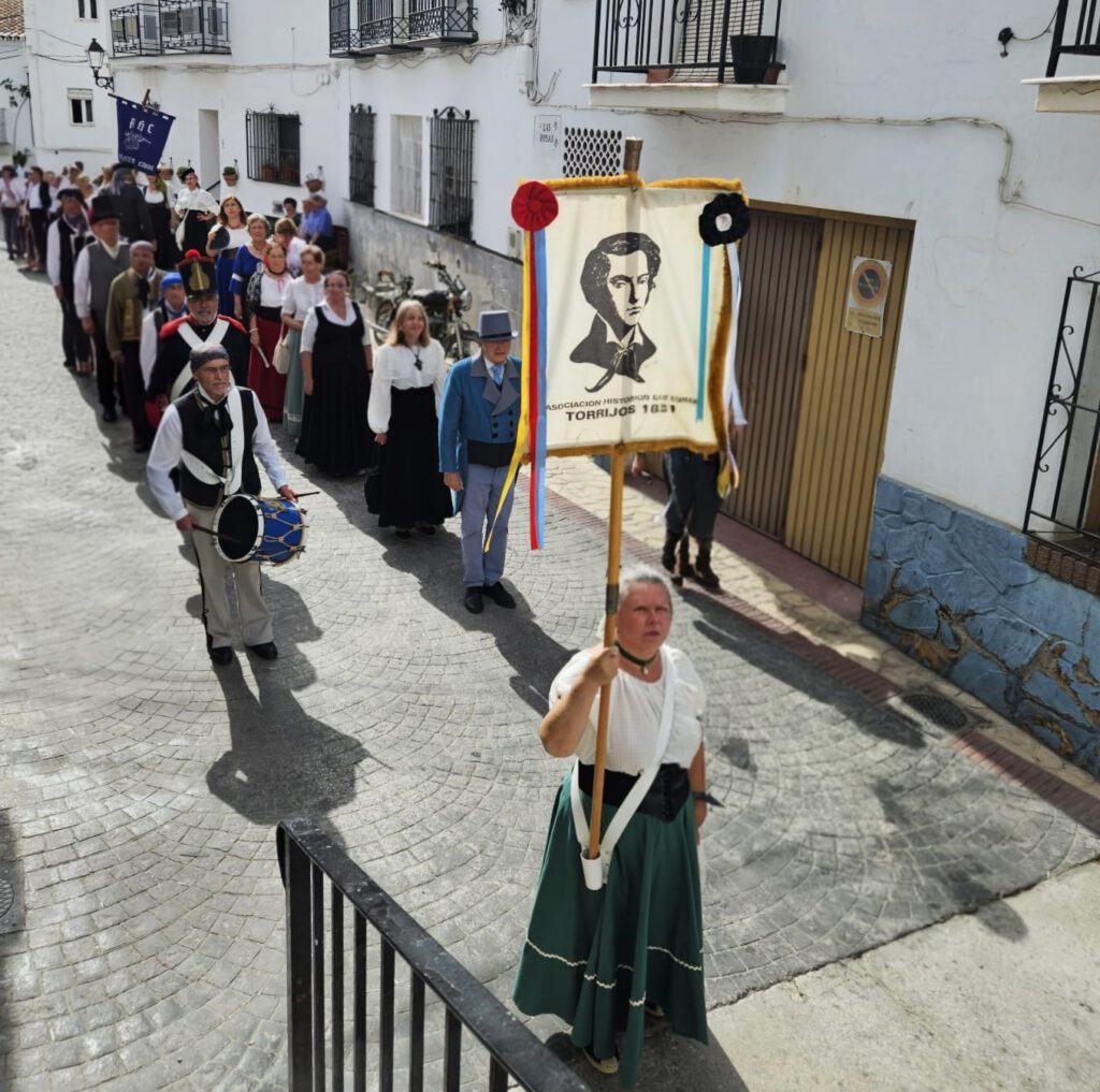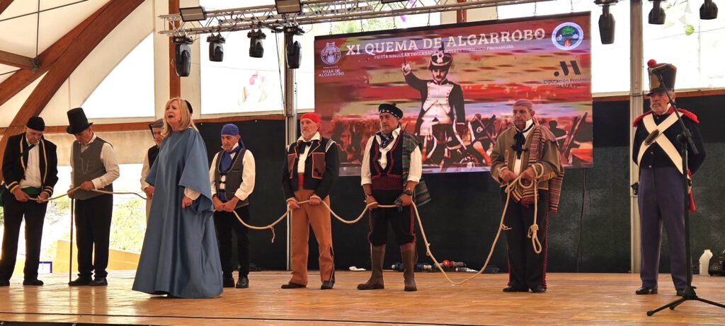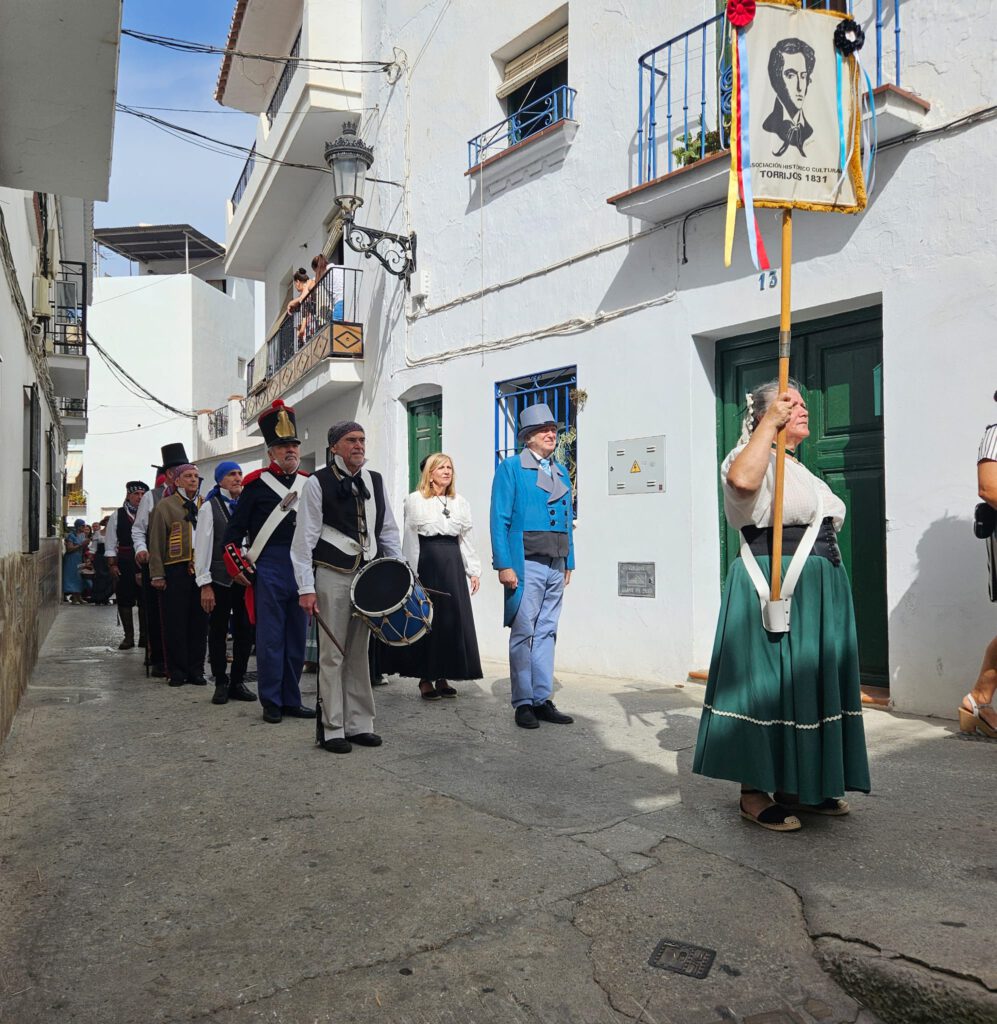 El pasado domingo 21 de septiembre, la Asociación Histórico Cultural Torrijos 1831 participó en el desfile realizado con ocasión de la 11ª Fiesta de Algarrobo, que cada año conmemora el intento de los franceses por hacer arder esta singular localidad de la Axarquía, en una acción de represalias durante la ocupación francesa de Málaga (1810-1812). Recordemos que, con nuestro estimado amigo Antonio Cordón, persona impulsora que supo prever el futuro que aguardaba a estas fiestas; la asociación Torrijos 1831 participó en las dos primeras ediciones de la Asociación Torrijos 1831, por entonces única asociación invitada, y germen de lo que son las actuales fiestas, que por mérito propio han alcanzado el puesto que gozan en la provincia de Málaga, gracias al colectivo local Asociación Quema de Algarrobo que, junto la importantísima ayuda del Ayuntamiento, las organiza. Recordar también, que nuestro presidente Esteban Alcántara fue, en su momento, uno de los pregoneros de la Quema de Algarrobo. Tras el desfile, a cada una de las asociaciones de recreaciones históricas que habían participado en el mismo, les correspondió hacer una recreación propia para el público, en el estrado levantado para los efectos en el centro del pueblo. La Asociación Torrijos 1831 teatralizó la última noche de los liberales de Torrijos, en el Refectorio del antiguo convento de San Andrés, con Alicia Gallego interpretando la Libertad, y Carmen Casán cantando la popular “cuerda de presos”, bajo los redobles bien acompasados de tambor, de Paco Gómez. Al finalizar el acto, la alcaldesa de Algarrobo entregó unos bonitos recuerdos a nuestra Asociación.