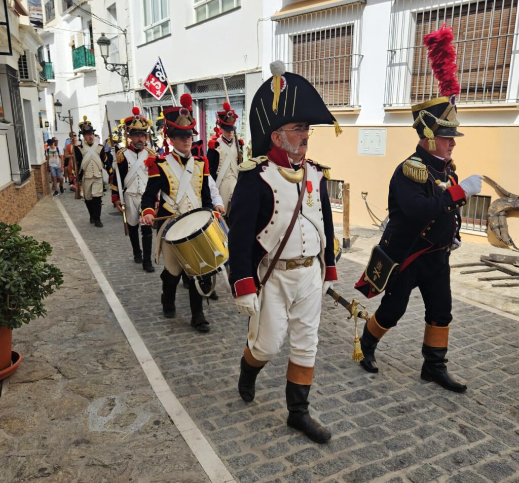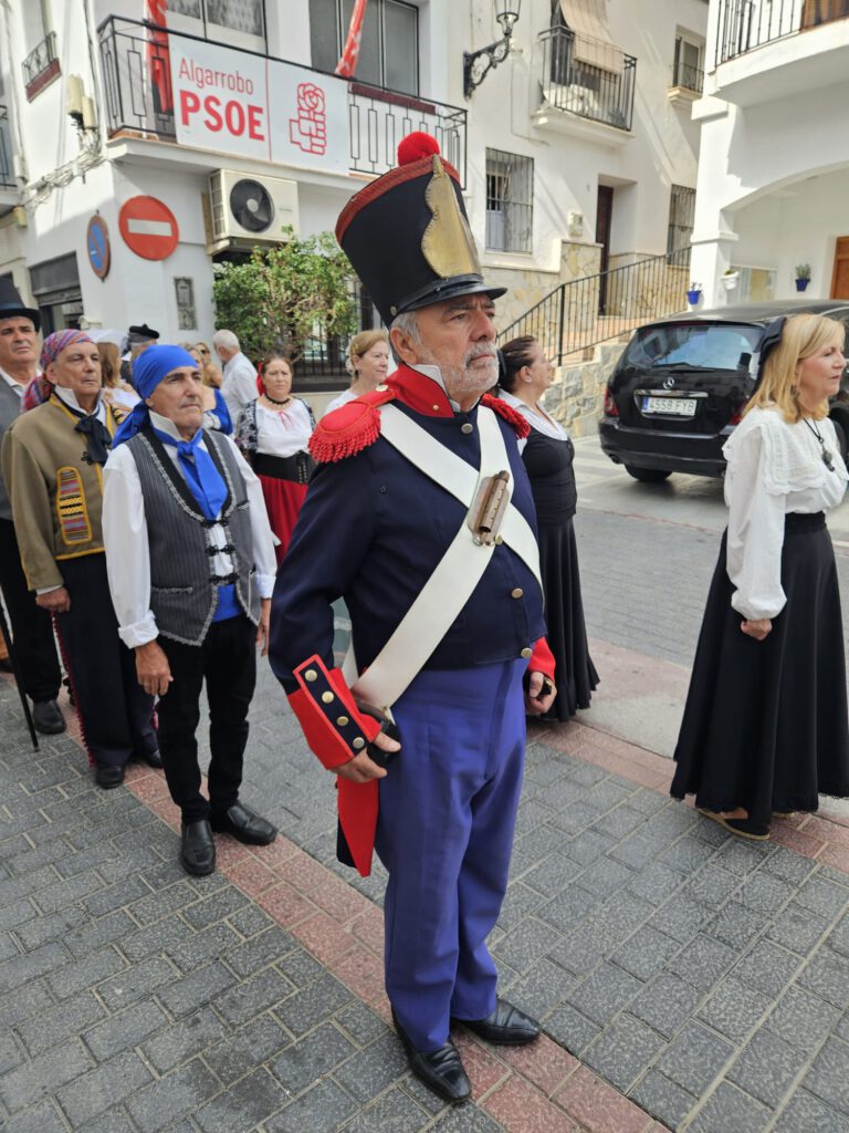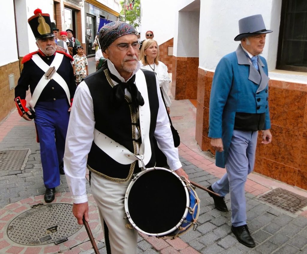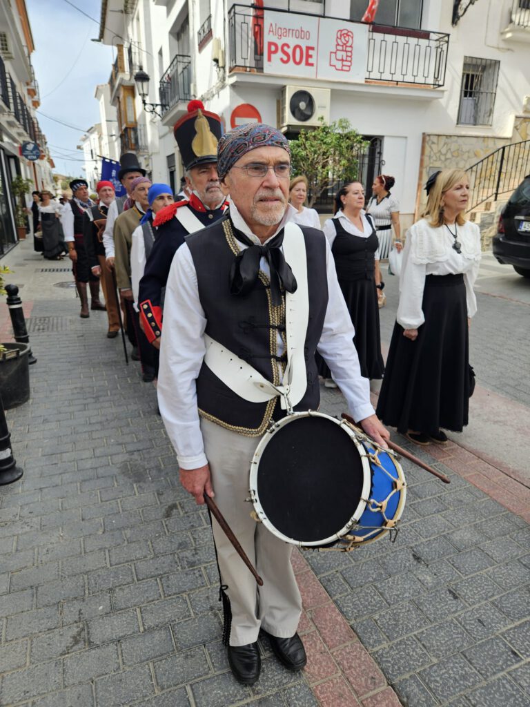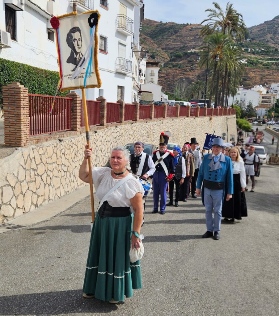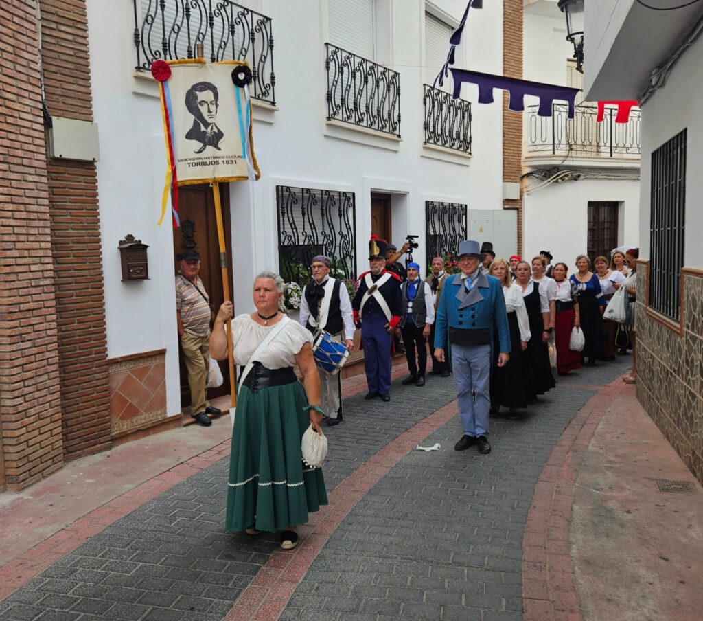 El pasado domingo 21 de septiembre, la Asociación Histórico Cultural Torrijos 1831 participó en el desfile realizado con ocasión de la 11ª Fiesta de Algarrobo, que cada año conmemora el intento de los franceses por hacer arder esta singular localidad de la Axarquía, en una acción de represalias durante la ocupación francesa de Málaga (1810-1812). Recordemos que, con nuestro estimado amigo Antonio Cordón, persona impulsora que supo prever el futuro que aguardaba a estas fiestas; la asociación Torrijos 1831 participó en las dos primeras ediciones de la Asociación Torrijos 1831, por entonces única asociación invitada, y germen de lo que son las actuales fiestas, que por mérito propio han alcanzado el puesto que gozan en la provincia de Málaga, gracias al colectivo local Asociación Quema de Algarrobo que, junto la importantísima ayuda del Ayuntamiento, las organiza. Recordar también, que nuestro presidente Esteban Alcántara fue, en su momento, uno de los pregoneros de la Quema de Algarrobo. Tras el desfile, a cada una de las asociaciones de recreaciones históricas que habían participado en el mismo, les correspondió hacer una recreación propia para el público, en el estrado levantado para los efectos en el centro del pueblo. La Asociación Torrijos 1831 teatralizó la última noche de los liberales de Torrijos, en el Refectorio del antiguo convento de San Andrés, con Alicia Gallego interpretando la Libertad, y Carmen Casán cantando la popular “cuerda de presos”, bajo los redobles bien acompasados de tambor, de Paco Gómez. Al finalizar el acto, la alcaldesa de Algarrobo entregó unos bonitos recuerdos a nuestra Asociación.