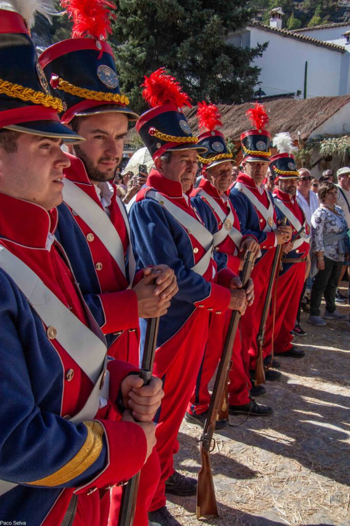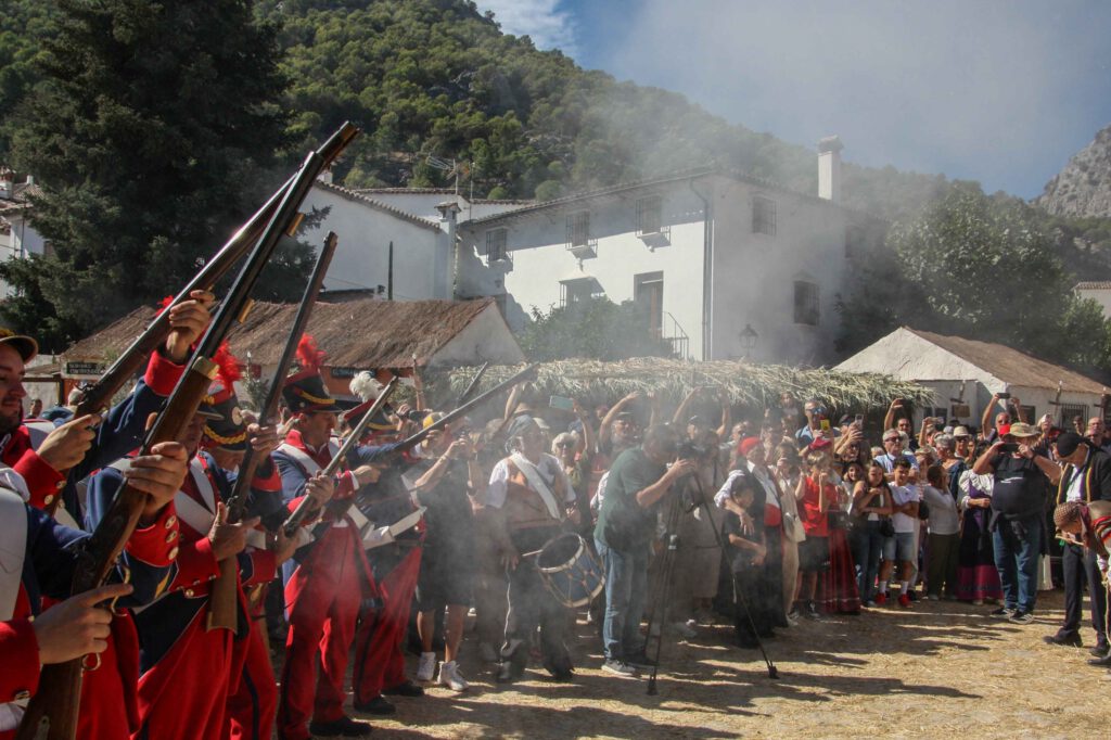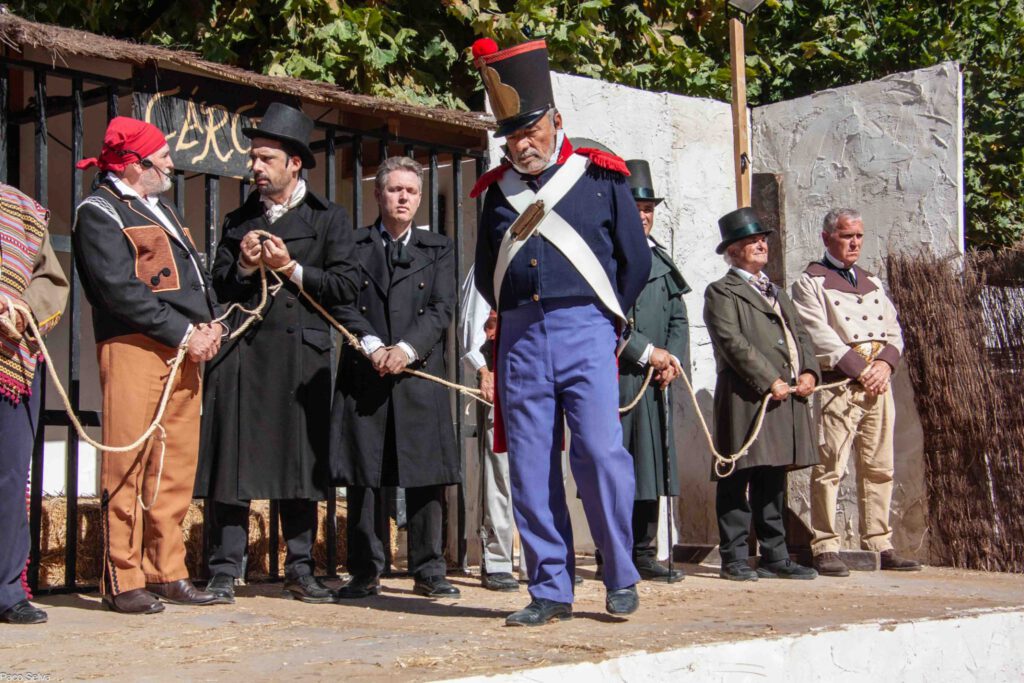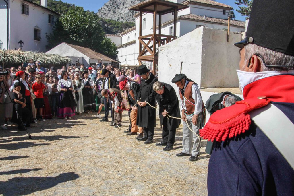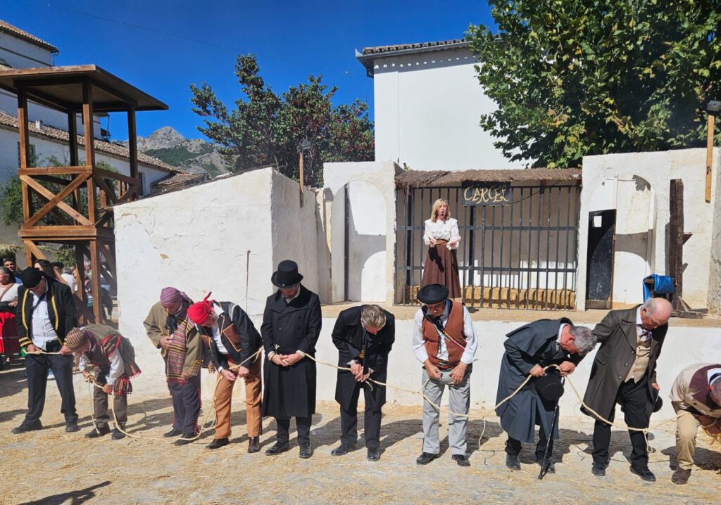 Invitada un año más por el Ayuntamiento de Grazalema y la asociación titular de este bellísimo pueblo gaditano, Bandoleros de Grazalema, el pasado 5 de octubre del presente 2025, domingo, la recreación “Réquiem por Torrijos” interpretada por los componentes de la Asociación Histórico Cultural Torrijos 1831, brilló una vez más ante los miles de visitantes que acudieron a la bella localidad de la sierra gaditana; tanto por la seriedad de su interpretación como por la solidez y singularidad de sus guiones propios. Presentó a la asociación su secretaria Flori Sastre, seguida por la introducción histórica de Esteban Alcántara. Después vino la interpretación de Enrique Parapar como Francisco Fernández Golfín, acompañado por los liberales de Torrijos, y la cantaora Mari Carmen Casán interpretando la “Cuerda de presos”, seguida por el redoble de tambor, realizado por Paco Gómez. Los liberales de Torrijos, detenidos y escoltados pasaron a prisión, en otra parte de los escenarios de Grazalema. Allí se interpretó “Los sedientos”, con José Antonio Millán, Carlos Corcoles, Sergio Doménech, José María, Miguel Vílchez y Juan Fernández, como actores principales, acompañados por Alicia Gallego representado la aparición de “La Libertad”. José Manuel Pérez protagonizó a González Moreno con voz en off. Tras el “fusilamiento” de los liberales de Torrijos, actuaron muy bien nuestras mujeres en la colocación del velos a los ya “difuntos” (agradecemos la colaboración de los «migueletes» de Grazalema en el acto del fusilamiento). En un siguiente artículo narraremos el final del acto de la Asociación Torrijos 1831, así como nuestros agradecimientos.