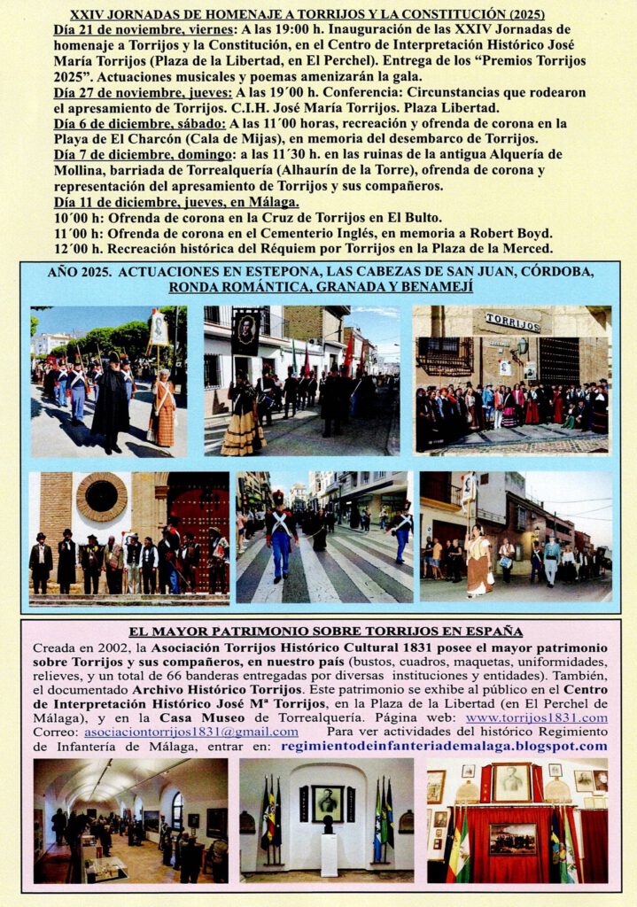 Día 21 de noviembre, viernes: A las 19:00 h. Inauguración de las XXIV Jornadas de homenaje a Torrijos y la Constitución, en el Centro de Interpretación Histórico José María Torrijos (Plaza de la Libertad, en El Perchel), con la gala de entrega de los “Premios Torrijos 2025”, amenizada con actuaciones musicales e interpretaciones poéticas.