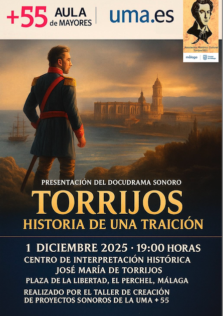 El próximo día 1 de diciembre, a partir de las 19´00 h. se presentará en el Centro de Interpretación Histórico José María Torrijos, el docudrama sonoro «Torrijos: la historia de una traición», elaborado por la Aula de Mayores de la UMA, y realizado por el taller de creación de Proyectos Sonoros de la UMA.