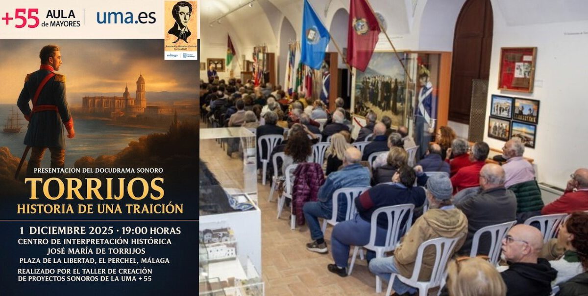 Dio la bienvenida a los presentes que ocupaban todo el aforo de Centro de Interpretación Histórico José María Torrijos, Esteban Alcántara, presidente de la Asociación Torrijos 1831 y Licenciado en Historia por la Universidad de Málaga; siguiéndole a continuación la periodista Paloma López Villafranca, doctora y licenciada en Comunicación Audiovisual y Periodismo, por la UMA, y directora y docente del Taller de creación de proyectos sonoros de la UMA. La profesora explicó el trabajo realizado y la dedicación de los alumnos. Recordemos que a Paloma le entregamos el Premio Torrijos en 2008. Cerró el apartado de presentaciones el veterano periodista malagueño Rafael Salas Gallego, que ha sido presidente del Colegio de Periodistas de Andalucía, en Málaga, y de la Asociación de Prensa en Málaga. Salas citó a todos los participantes de la obra, así como el fin del docudrama que, sonorizado, fue muy bien acogido por el público presente.