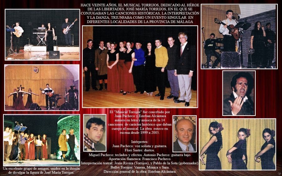 Asociación Torrijos 1831.- En agradecimiento por lo que significaron, los integrantes de la Asociación Torrijos 1831 mantienen viva hoy la memoria para aquellos hechos que precedieron, e incidieron, en la posterior fase constituyente de nuestro colectivo, a finales de 2002, quedando registrado oficialmente en 2003. Por eso estamos recordando lo que supuso la publicación del libro «Del Charcón a la Alquería: un camino para Torrijos», en 2000, y los trabajos previos de investigación recogidos en el citado libro. Hoy nos toca recordar con aprecio, lo que supuso la creación del «Musical Torrijos», en 1999, como un hecho singular en el mundo de las representaciones malacitanas, a final del siglo XX, por su puesta en escena, con catorce canciones de corte histórico, interpretadas en directo, a las que acompañaban interpretaciones teatrales y un ballet, que sumaba la danza al espectáculo. El «Musical Torrijos» fue concebido y registrado en la Sociedad de Autores por Juan Pacheco y Esteban Alcántara, autores de letra, música y arreglos, de las canciones que daban el cuerpo a la obra, con el añadido de la parte teatral, que contó con los guiones de Jesús Rivera, y la capacidad creativa de las integrantes del ballet Torrijos. Formaron parte de la obra: Juan Pacheco, voz solista y guitarra (rítmica y solista). Flori Sastre, duetos. Miguel Pacheco, teclados y efectos. Antonio Pacheco, guitarra bajo. Francisco Pacheco, aportación flamenca. Interpretación teatral, Jesús Rivera (dando vida a Torrijos), y Pablo de la Sota (el gobernador). El ballet Torrijos lo integraron, Sara, Vanesa y Mónica. El musical estuvo en escena ocho años (1999-2006). Más datos para los lectores que siguen nuestras noticias, a continuación.