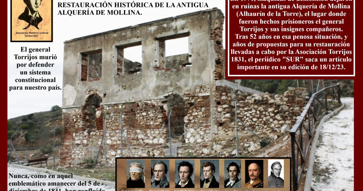 En Alhaurín de la Torre, se consiguió colocar un monumento en la parte oeste del pueblo, que refleja el encuentro de los liberales contra los voluntarios realistas de esa localidad, el día 3 de diciembre de 1831. Además, el colectivo torrijista ha realizado a lo largo de 21 años diversas representaciones teatrales y conferencias, en Alhaurín, colaborando en cuantas veces ha sido llamada por el consistorio. En 2002, se llevó a cabo la que hoy es la primera recreación histórica hecha en Andalucía, la “Cuerda de presos” de Torrealquería, a la que añadió en 2005 “La rendición de Torrijos en la Alquería de Mollina”. Ambas se representan anualmente en el lugar de los hechos a principios de cada mes de diciembre. Sin embargo, hasta este 2023 no se ha conseguido la restauración en condiciones del único lugar que queda en la provincia de Málaga en deuda histórica con Torrijos y sus compañeros: la recuperación de la antigua Alquería de Mollina, con un aspecto exterior histórico y un interior funcional que acoja un centro de interpretación histórico sobre los hechos que ocurrieron allí entre el 3 y 5 de diciembre de 1831. Un esfuerzo restaurador que logre recuperar todo lo que queda allí de la antigua Alquería. A este respecto, la Asociación Torrijos 1831 no puede hacer más de lo que ha realizado en 21 años, y que no ha sido nada fácil, pero todo queda en manos de lo que decida, en un fututo, en sus responsabilidades, el equipo de gobierno de Alhaurín de la Torre. Ojalá se llegue a tiempo de rescatar estas históricas ruinas, y que los elementos atmosféricos no terminen echar abajo los escuálidos muros que todavía resisten. La memoria de Torrijos y sus compañeros, sacrificados por sus ideales constitucionalistas y el patrimonio histórico de Alhaurín de la Torre, lo merecen.