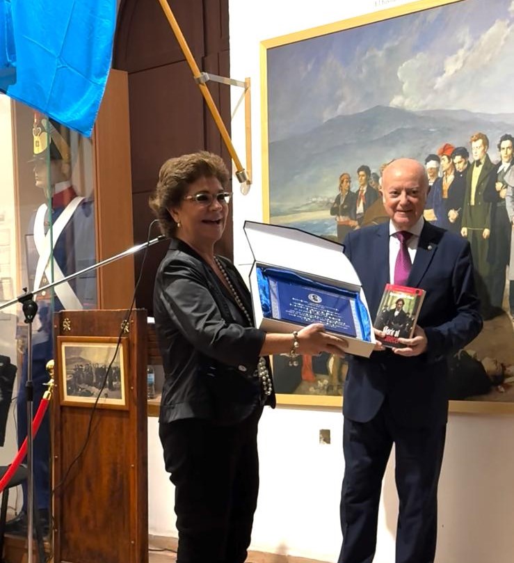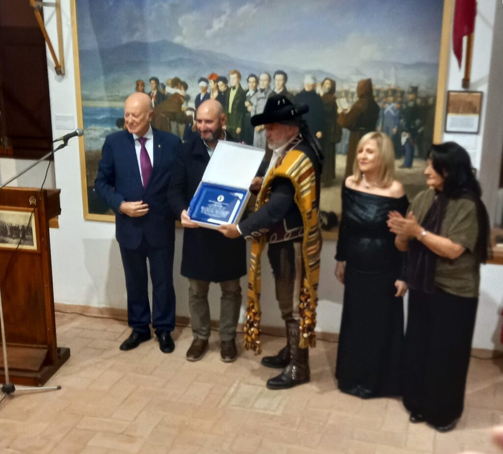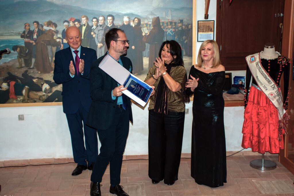 “Premio a Recreación Histórica 2025, a Benamejí Bandolera”, por la recuperación histórica-literaria que ha hecho sobre la figura de la Duquesa de Benamejí y del bandolerismo, ambos relacionados con esa localidad y sus alrededores. Recogieron el premio el concejal de Cultura de Benamejí, Gonzalo, y el presidente de la Asociación bandolera, José Melero. Este último nos entregó un bello recuerdo por estar hermanados los dos colectivos desde hace dos años. Por su parte, el concejal nos entregó la bandera municipal de Benamejí, que fue tremolada por Domingo Adán.